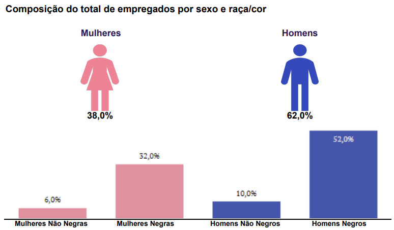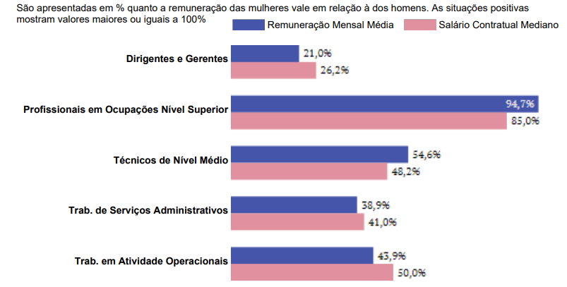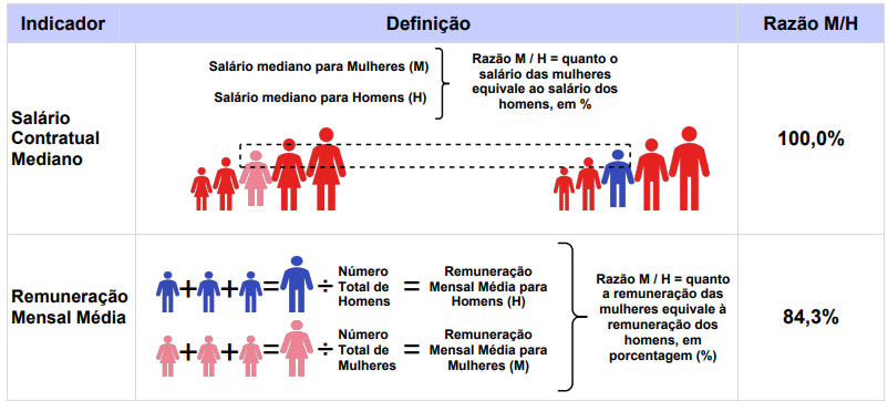 - O salário contratual mediano das mulheres equivale a 100.0% do recebido pelos homens.