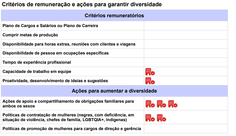 Para cada grupo de ocupação que não apresenta cálculo da diferença, para salário de contratação ou para remuneração média, pode ter ocorrido um dos seis motivos:(1) por ter menos de três mulheres; (2) por ter menos de três homens; (3) por não ter mulheres; (4) por não ter homens; (5) por não ter três homens nem três mulheres naquele grupo ocupacional; (6) por não ter nem homens nem mulheres naquele grupo ocupacional.